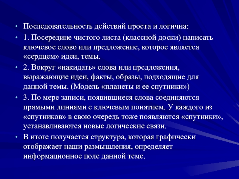 В итоге получается структура, которая графически отображает наши размышления, определяет информационное поле данной теме.