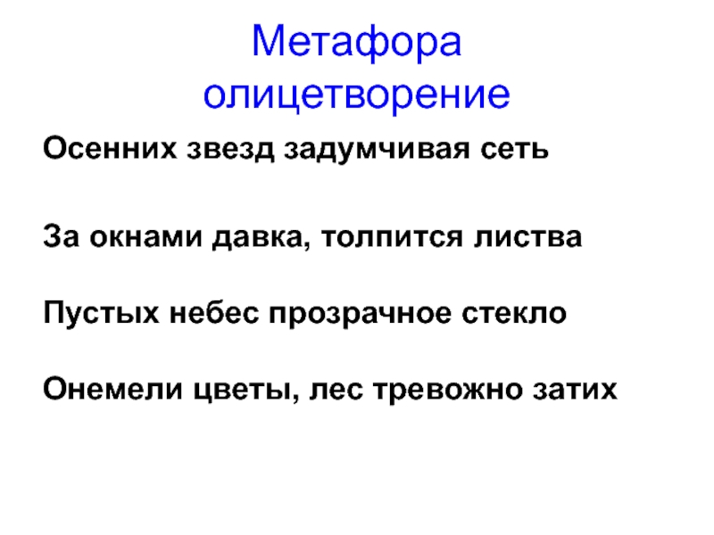 Метафора олицетворениеОсенних звезд задумчивая сетьЗа окнами давка, толпится листваПустых небес прозрачное стеклоОнемели цветы, лес тревожно затих