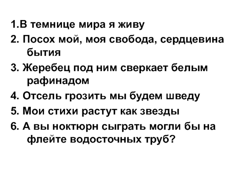 1.В темнице мира я живу2. Посох мой, моя свобода, сердцевина бытия3. Жеребец под ним сверкает белым рафинадом4.