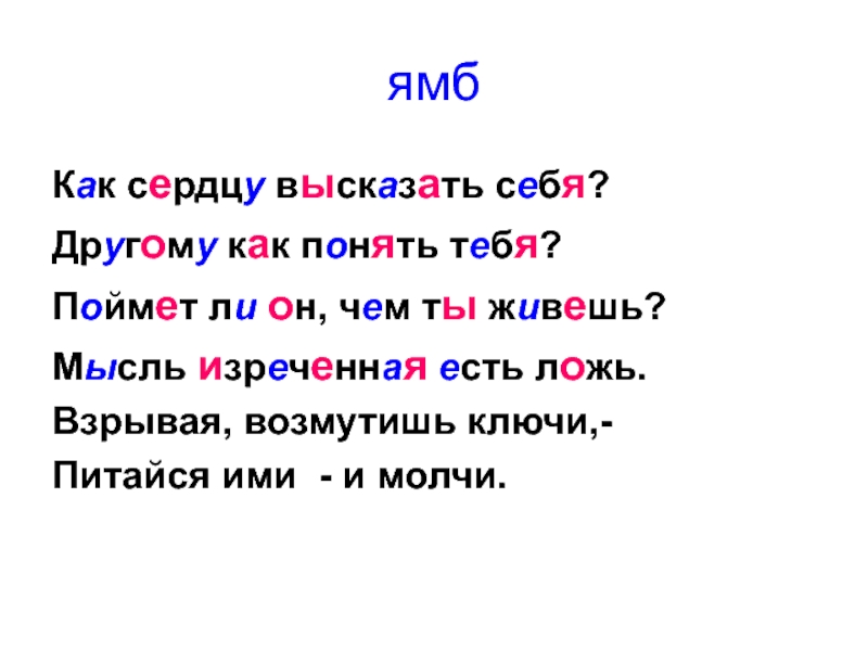 ямбКак сердцу высказать себя?Другому как понять тебя?Поймет ли он, чем ты живешь?Мысль изреченная есть ложь.Взрывая, возмутишь ключи,-Питайся