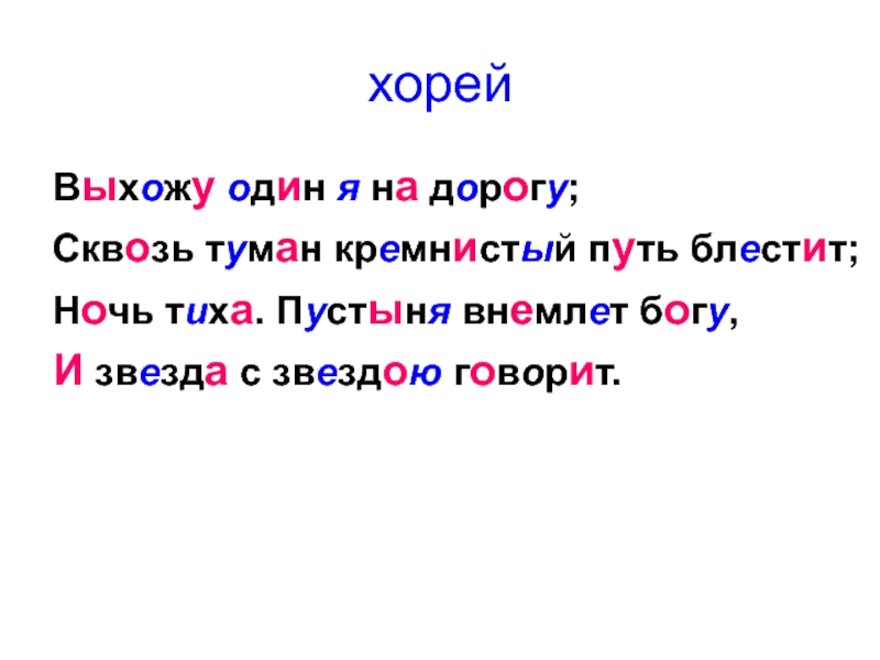 хорейВыхожу один я на дорогу;Сквозь туман кремнистый путь блестит;Ночь тиха. Пустыня внемлет богу,И звезда с звездою говорит.