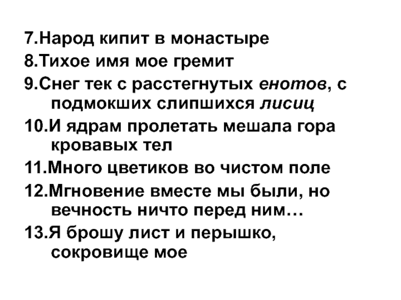 7.Народ кипит в монастыре8.Тихое имя мое гремит9.Снег тек с расстегнутых енотов, с подмокших слипшихся лисиц10.И ядрам пролетать