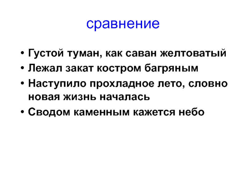сравнениеГустой туман, как саван желтоватыйЛежал закат костром багрянымНаступило прохладное лето, словно новая жизнь началасьСводом каменным кажется небо
