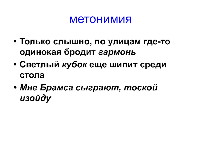 метонимияТолько слышно, по улицам где-то одинокая бродит гармоньСветлый кубок еще шипит среди столаМне Брамса сыграют, тоской изойду