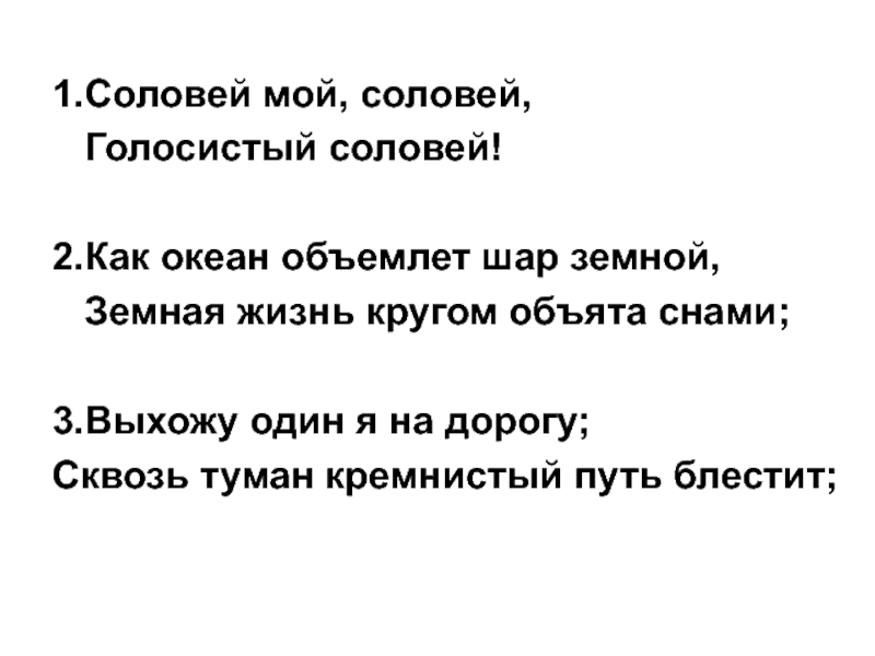 1.Соловей мой, соловей,  Голосистый соловей!2.Как океан объемлет шар земной,  Земная жизнь кругом объята снами;3.Выхожу один