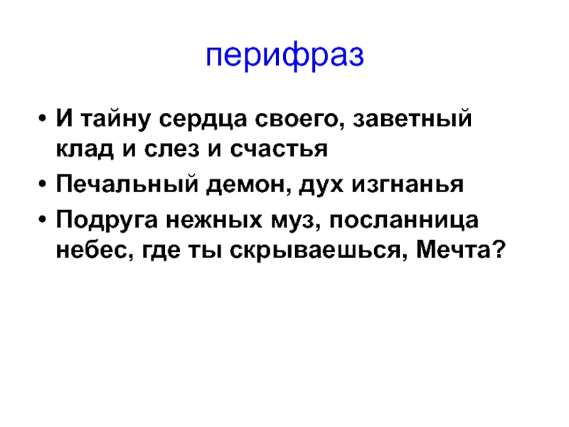 перифразИ тайну сердца своего, заветный клад и слез и счастьяПечальный демон, дух изгнаньяПодруга нежных муз, посланница небес,