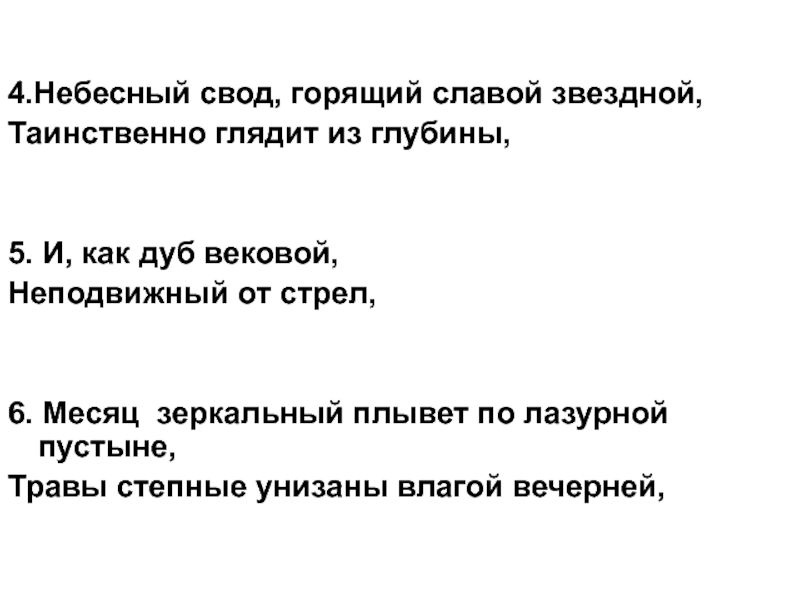 4.Небесный свод, горящий славой звездной,Таинственно глядит из глубины,5. И, как дуб вековой, Неподвижный от стрел,6. Месяц зеркальный