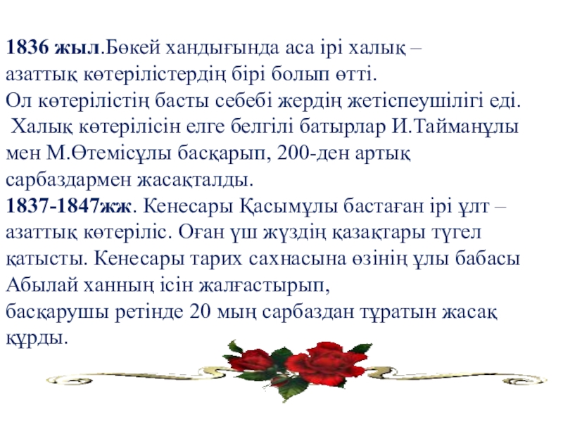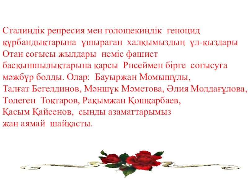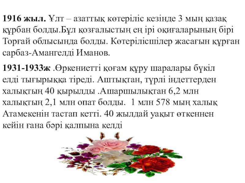 1931-1933ж .Өркениетті қоғам құру шаралары бүкіл елді тығырыққа тіреді. Аштықтан, түрлі індеттерден халықтың 40 қырылды .Ашаршылықтан 6,2 млн халықтың 2,1 млн опат болды. 1 млн 578 мың халық Атамекенін тастап кетті. 40 жылдай уақыт өткеннен кейін ғана бәрі қалпына келді