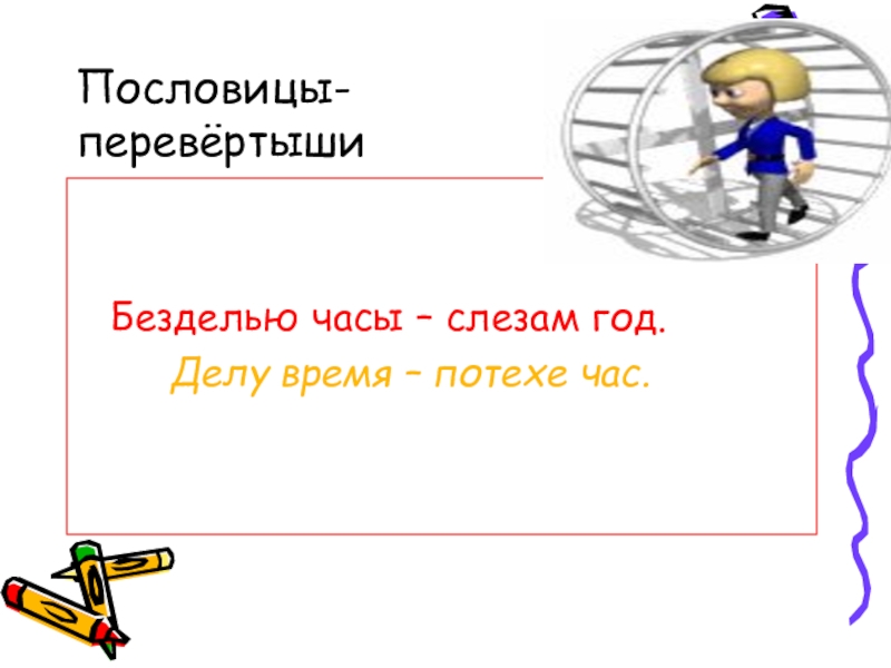 Пословицы-перевёртыши  Безделью часы – слезам год.     Делу время – потехе час.
