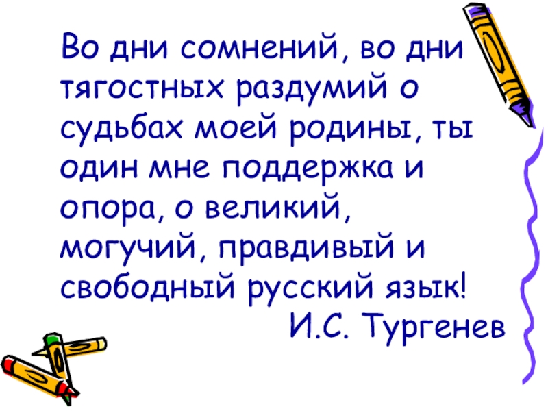 Во дни сомнений, во дни тягостных раздумий о судьбах моей родины, ты один мне поддержка и опора, о великий, могучий, правдивый и свободный русский язык! И.С. Тургенев