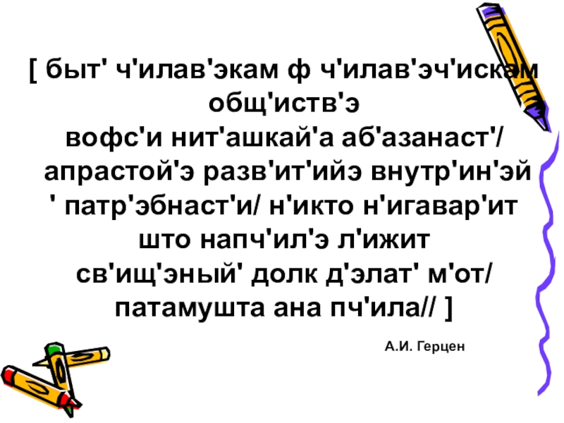 Слайд 6[ быт' ч'илав'экам ф ч'илав'эч'искам общ'иств'э