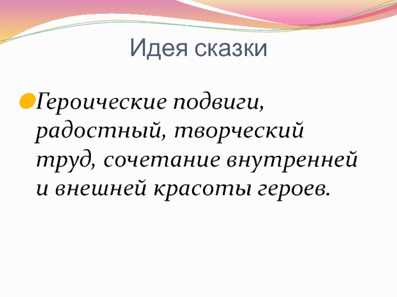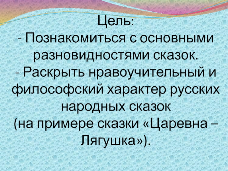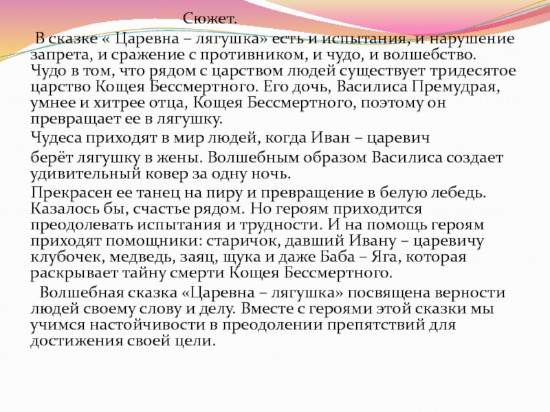 Волшебная сказка «Царевна – лягушка» посвящена верности людей своему слову и делу. Вместе с героями этой сказки мы учимся настойчивости в преодолении препятствий для достижения своей цели.
