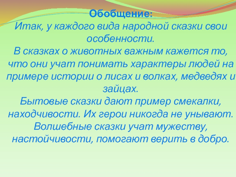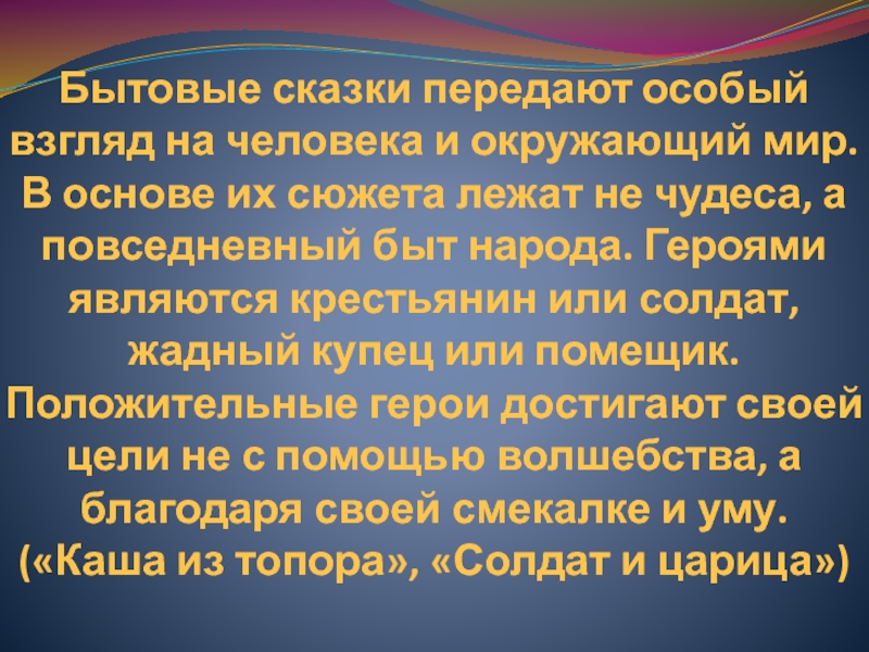 Слайд 6Бытовые сказки передают особый взгляд на человека и окружающий мир.