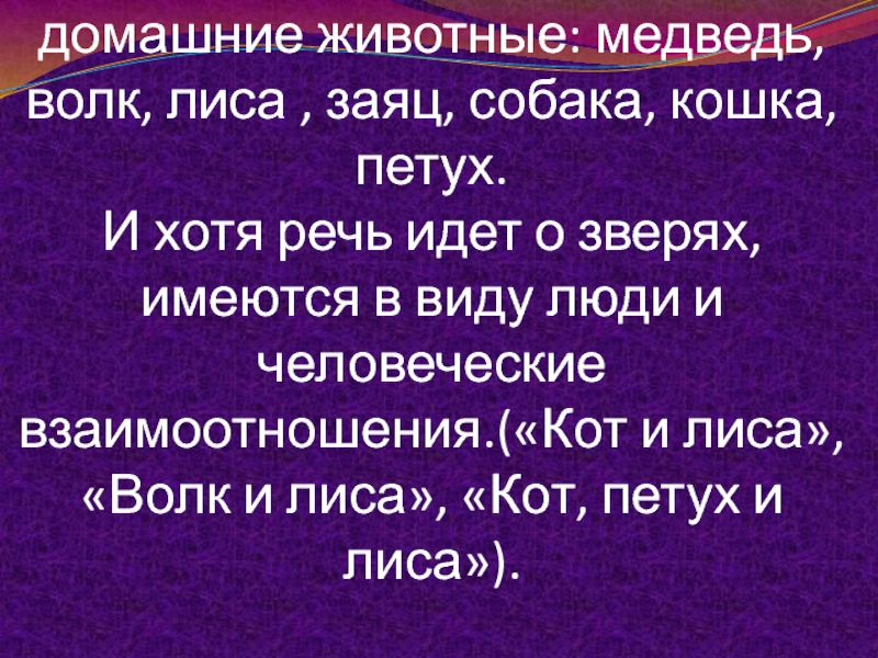 И хотя речь идет о зверях, имеются в виду люди и человеческие взаимоотношения.(«Кот и лиса», «Волк и лиса», «Кот, петух и лиса»).