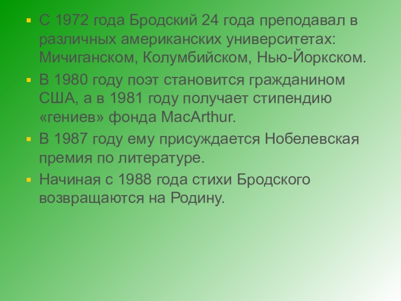 Слайд 8С 1972 года Бродский 24 года преподавал в различных американских университетах: