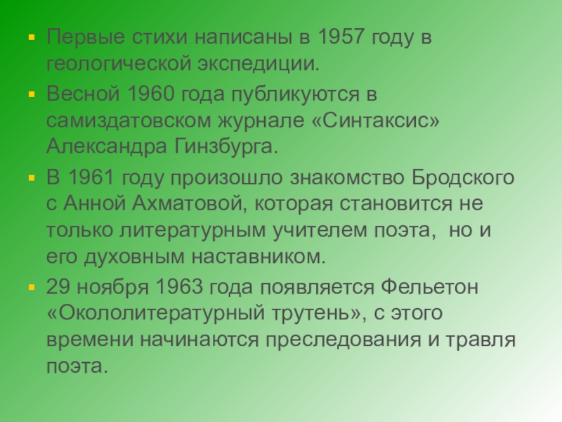 Слайд 6Первые стихи написаны в 1957 году в геологической экспедиции.