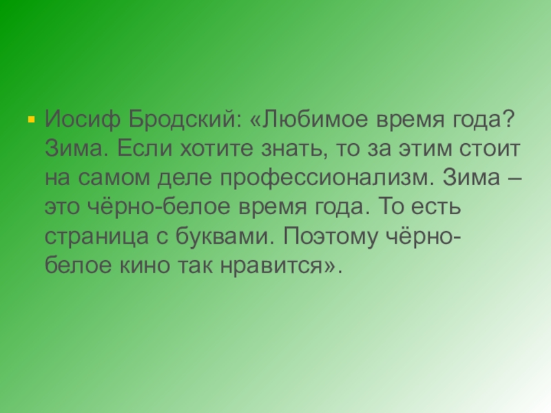 Слайд 14Иосиф Бродский: «Любимое время года? Зима. Если хотите знать, то за