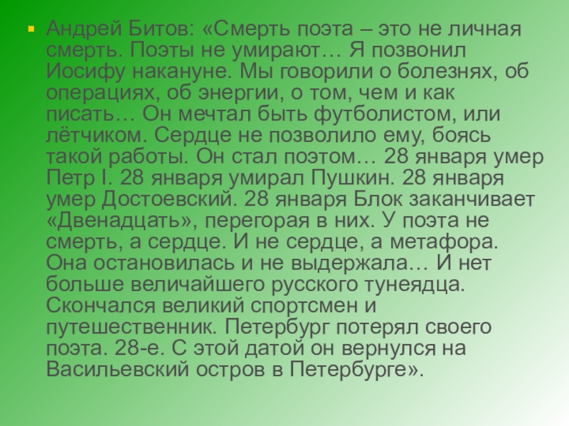 Слайд 16Андрей Битов: «Смерть поэта – это не личная смерть. Поэты не