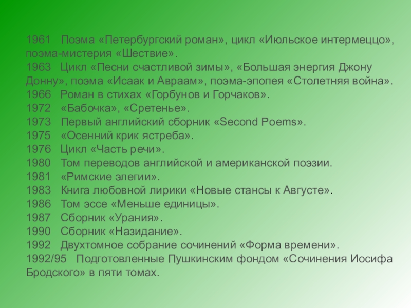Слайд 111961 Поэма «Петербургский роман», цикл «Июльское интермеццо», поэма-мистерия «Шествие».
