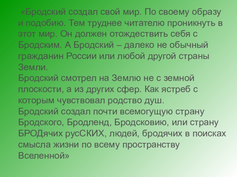 Слайд 12 «Бродский создал свой мир. По своему образу и подобию. Тем