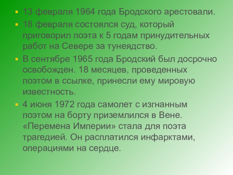 Слайд 713 февраля 1964 года Бродского арестовали.