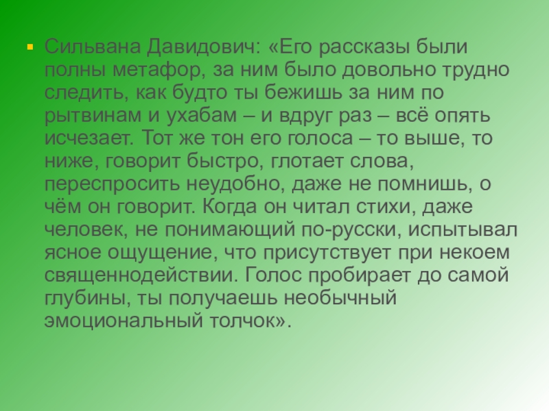 Слайд 15Сильвана Давидович: «Его рассказы были полны метафор, за ним было довольно