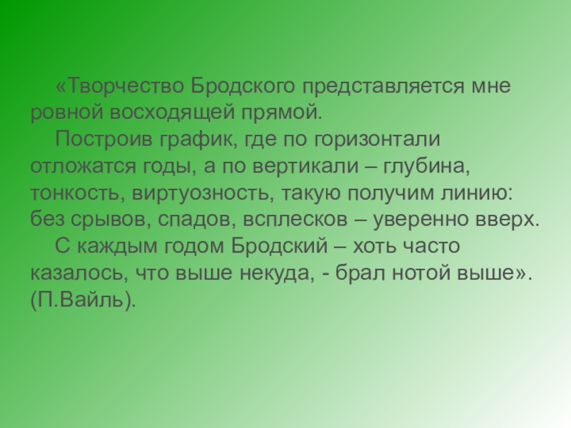 Слайд 4 «Творчество Бродского представляется мне ровной восходящей прямой.