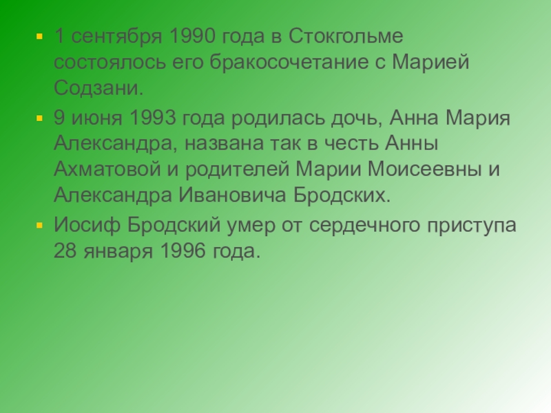 9 июня 1993 года родилась дочь, Анна Мария Александра, названа так в честь Анны Ахматовой и родителей Марии Моисеевны и Александра Ивановича Бродских.