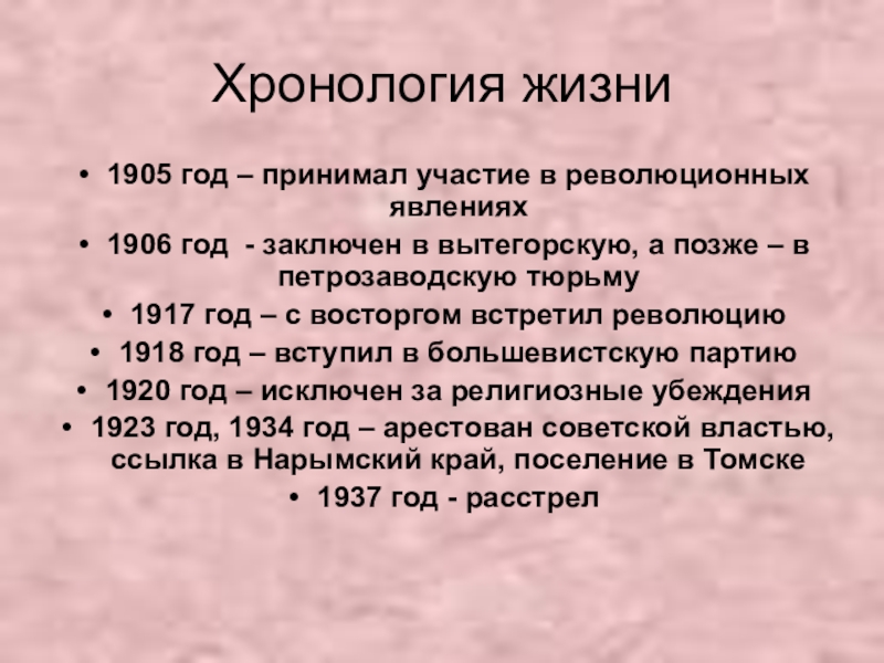 1923 год, 1934 год – арестован советской властью, ссылка в Нарымский край, поселение в Томске