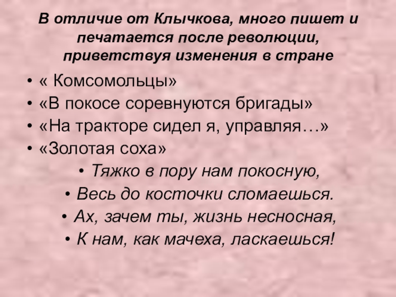 Слайд 31В отличие от Клычкова, много пишет и печатается после революции, приветствуя
