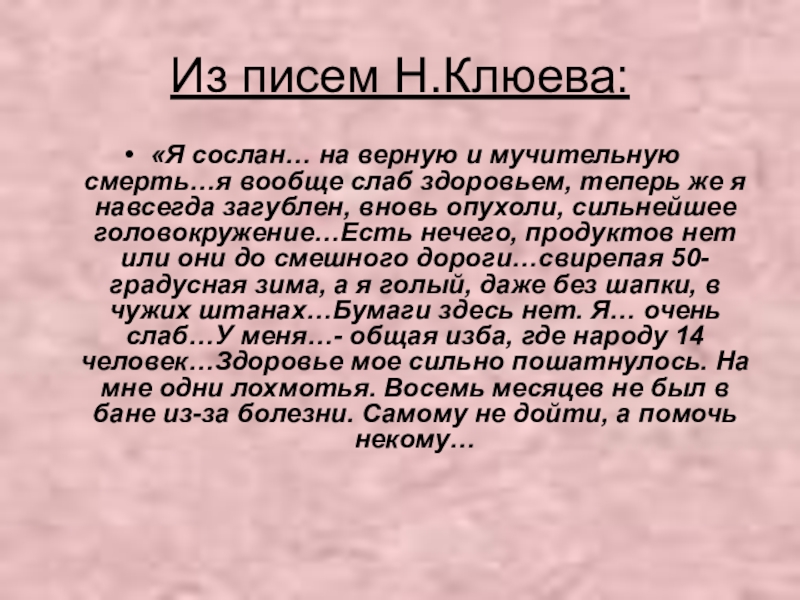 здоровьем, теперь же я навсегда загублен, вновь опухоли, сильнейшее головокружение…Есть нечего, продуктов нет или они до смешного дороги…свирепая 50-градусная зима, а я голый, даже без шапки, в чужих штанах…Бумаги здесь нет. Я… очень слаб…У меня…- общая изба, где народу 14 человек…Здоровье мое сильно пошатнулось. На мне одни лохмотья. Восемь месяцев не был в бане из-за болезни. Самому не дойти, а помочь некому…