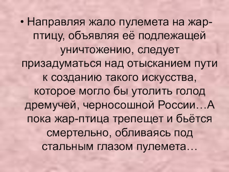 Слайд 19Направляя жало пулемета на жар-птицу, объявляя её подлежащей уничтожению, следует призадуматься
