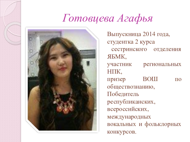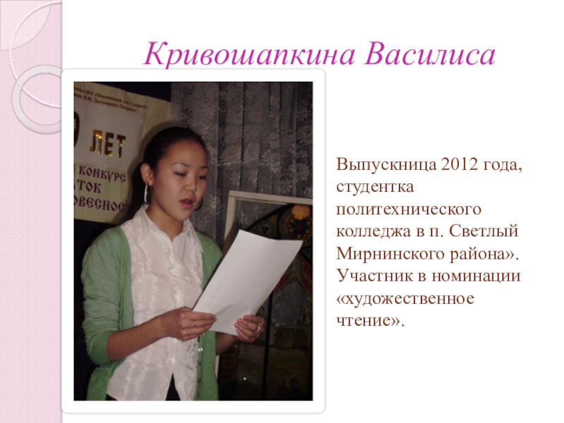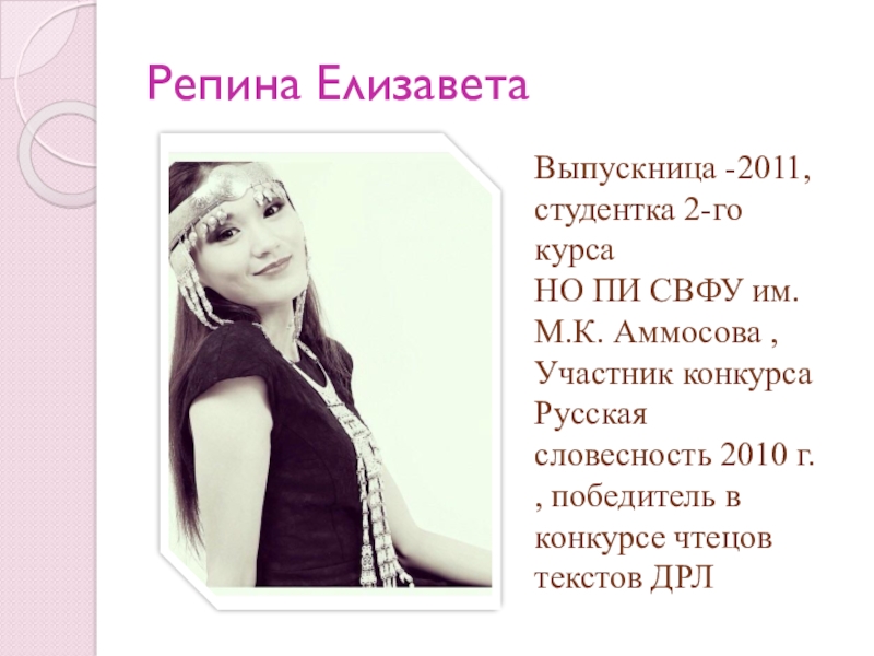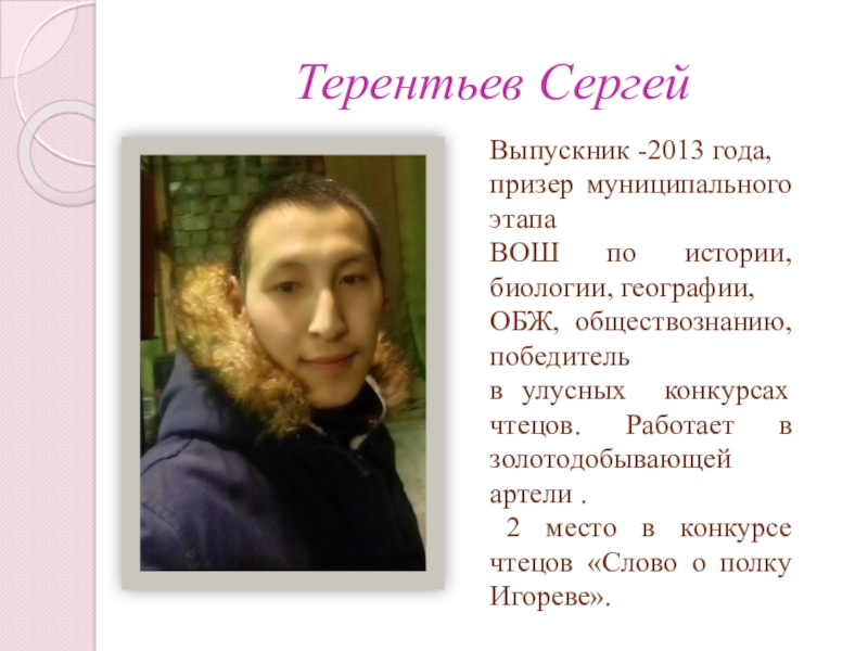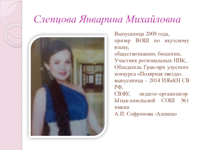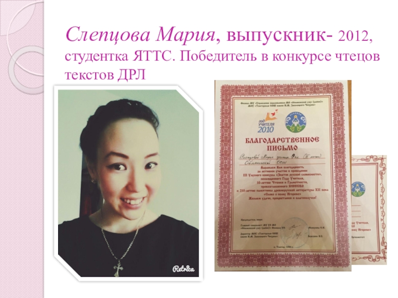 Слайд 15Слепцова Мария, выпускник- 2012, студентка ЯТТС. Победитель в конкурсе чтецов текстов