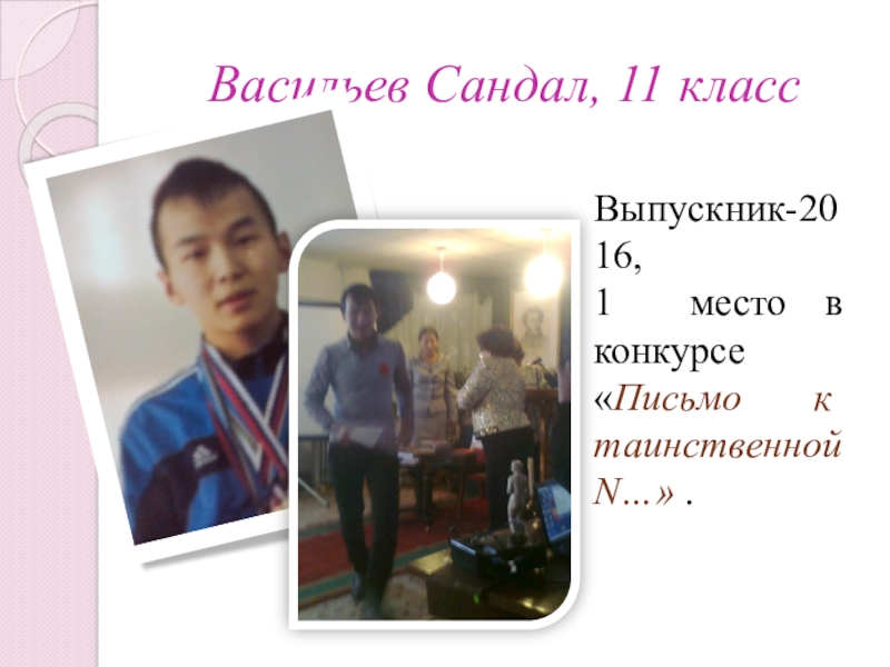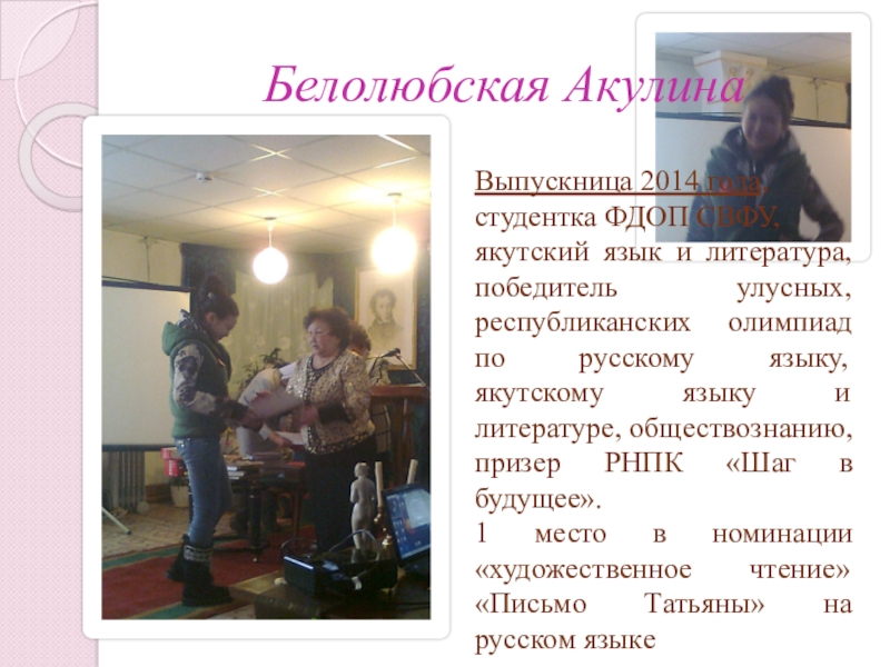 выпускница-2015, обладатель Золотой медали, победитель улусных,республиканских олимпиад по русскому языку,