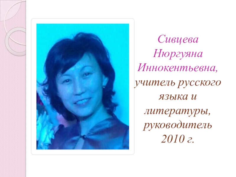 Слайд 3Сивцева Нюргуяна Иннокентьевна, учитель русского языка и литературы, руководитель 2010 г.