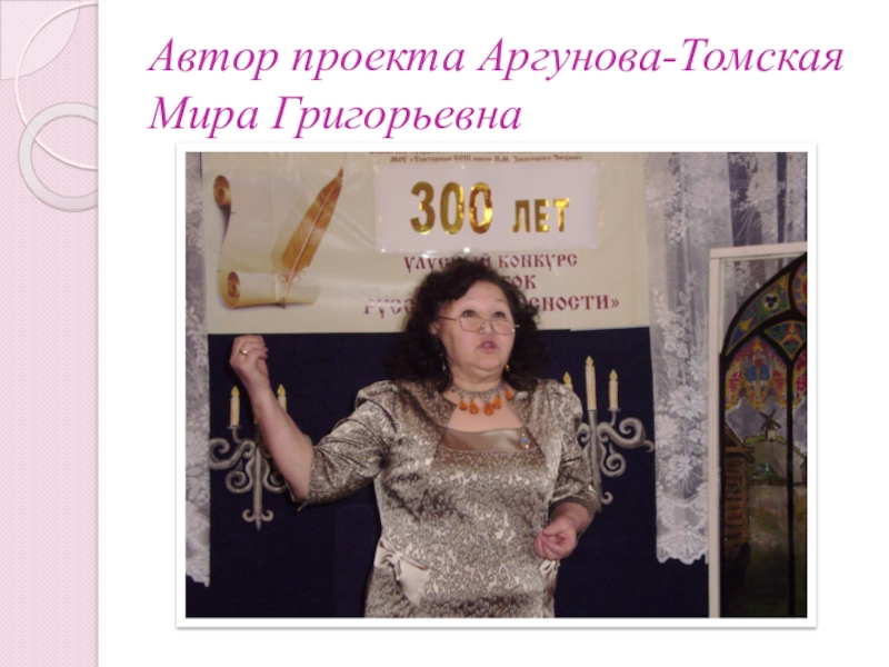 Слайд 20Автор проекта Аргунова-Томская Мира Григорьевна