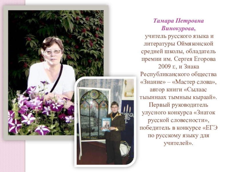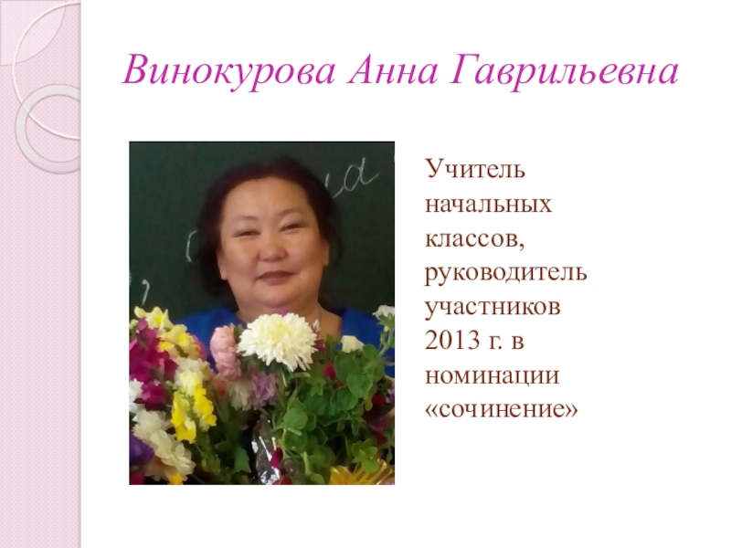 Слайд 5Заровняева Марианна Владимировна, учитель якутского языка и литературы, руководитель конкурса 2012г.