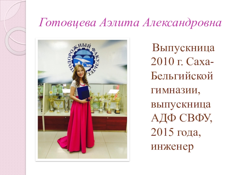Выпускница 2010 г. Саха-Бельгийской гимназии, выпускница АДФ