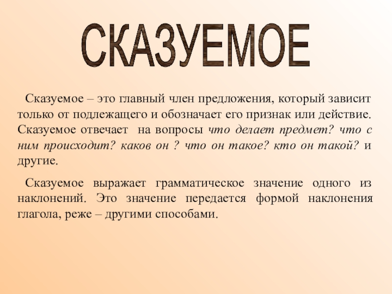 и обозначает его признак или действие. Сказуемое отвечает на вопросы что делает предмет? что с ним происходит? каков он ? что он такое? кто он такой? и другие.