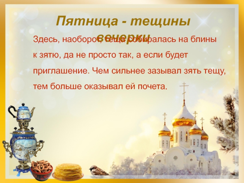 на блины к зятю, да не просто так, а если будет приглашение. Чем сильнее зазывал зять тещу, тем больше оказывал ей почета.