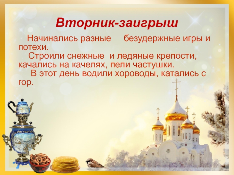 Вторник-заигрыш   Начинались разные   безудержные игры и потехи.  Строили снежные и ледяные крепости,