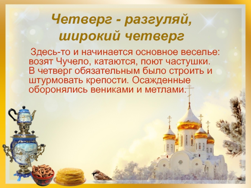 Четверг - разгуляй, широкий четверг Здесь-то и начинается основное веселье:  возят Чучело, катаются, поют частушки.В четверг