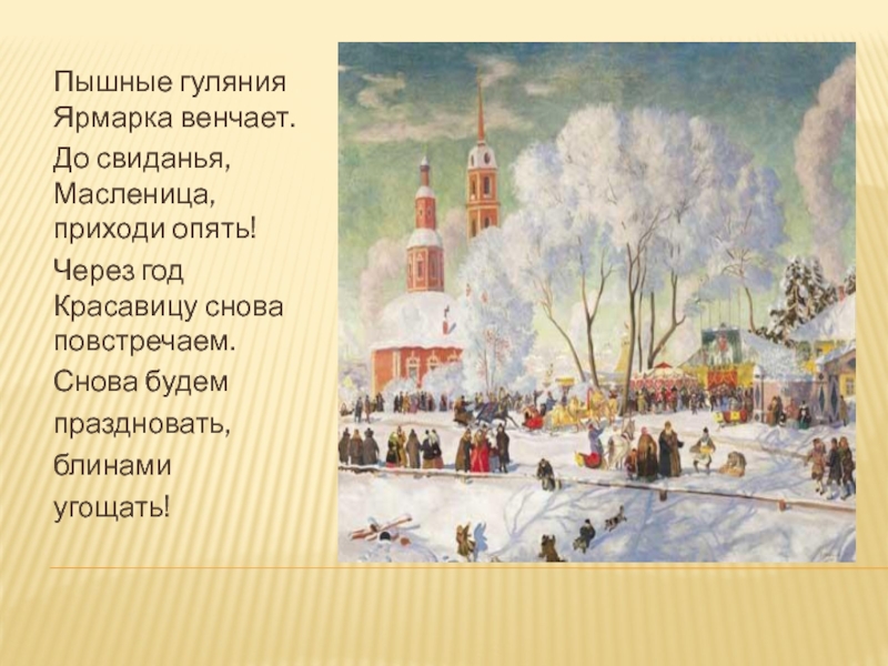 Пышные гуляния Ярмарка венчает.До свиданья, Масленица, приходи опять!Через год Красавицу снова повстречаем.Снова будем праздновать, блинами угощать!
