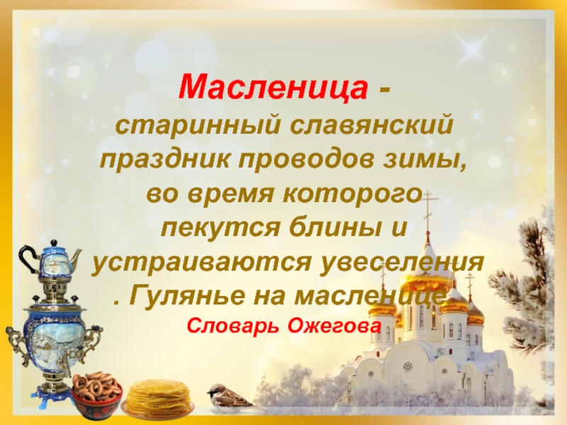 Масленица - старинный славянский праздник проводов зимы, во время которого пекутся блины и устраиваются увеселения . Гулянье