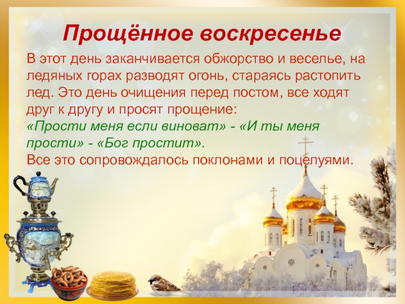 Прощённое воскресеньеВ этот день заканчивается обжорство и веселье, на ледяных горах разводят огонь, стараясь растопить лед. Это
