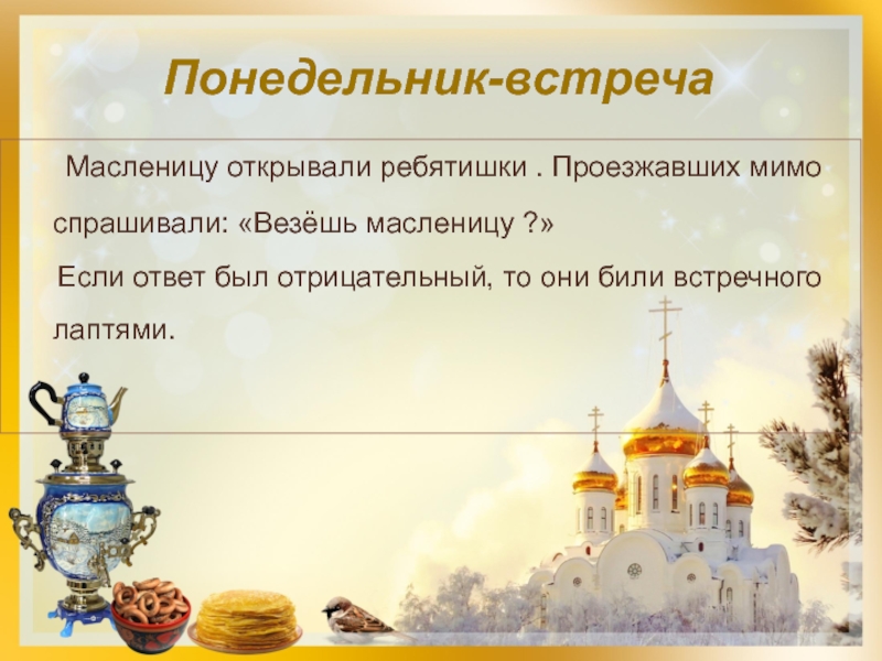 Понедельник-встреча    Масленицу открывали ребятишки . Проезжавших мимо спрашивали: «Везёшь масленицу ?»   Если