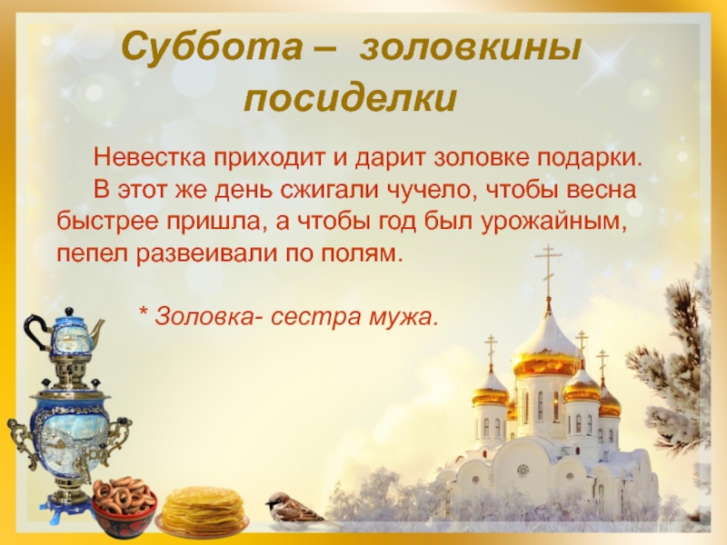 Суббота – золовкины посиделки     Невестка приходит и дарит золовке подарки.   В