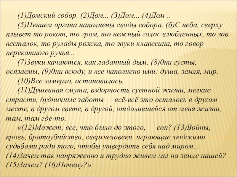 «(12)Может, все, что было до этого, — сон? (13)Войны, кровь, братоубийство, сверхчеловеки, играющие людскими судьбами ради того, чтобы утвердить себя над миром... (14)3ачем так напряженно и трудно живем мы на земле нашей? (15)3ачем? (16)Почему?»