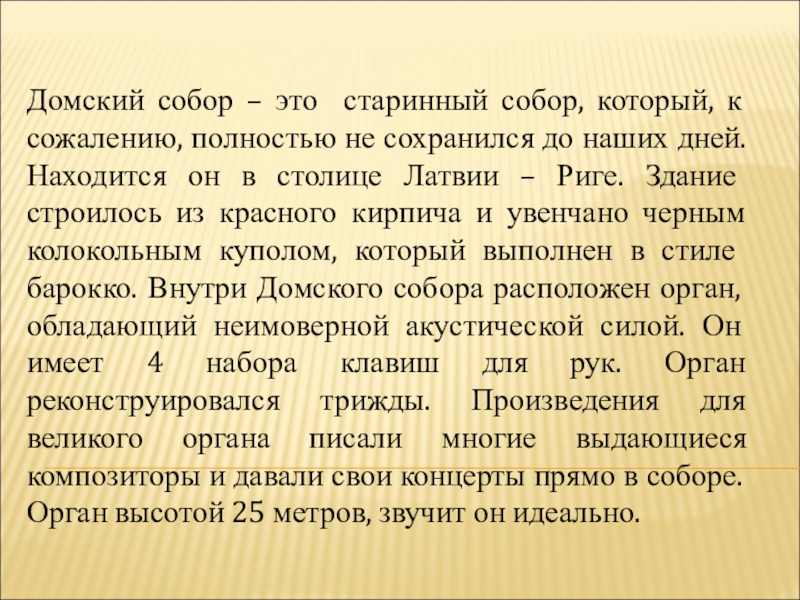 не сохранился до наших дней. Находится он в столице Латвии – Риге. Здание строилось из красного кирпича и увенчано черным колокольным куполом, который выполнен в стиле барокко. Внутри Домского собора расположен орган, обладающий неимоверной акустической силой. Он имеет 4 набора клавиш для рук. Орган реконструировался трижды. Произведения для великого органа писали многие выдающиеся композиторы и давали свои концерты прямо в соборе. Орган высотой 25 метров, звучит он идеально.