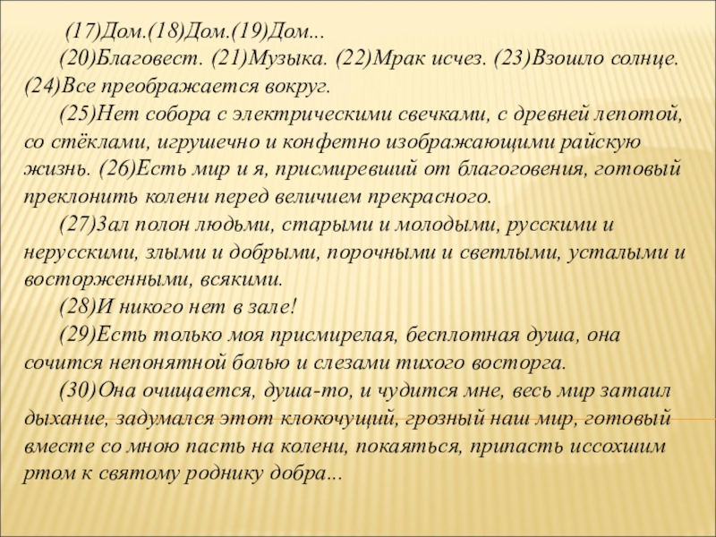 (25)Нет собора с электрическими свечками, с древней лепотой, со стёклами, игрушечно и конфетно изображающими райскую жизнь. (26)Есть мир и я, присмиревший от благоговения, готовый преклонить колени перед величием прекрасного.